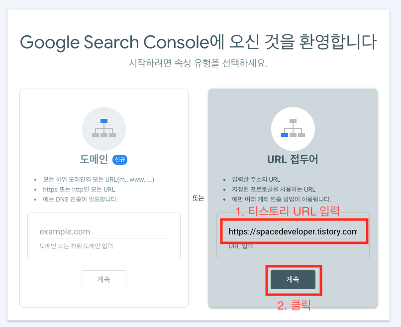 2.URL 접두어 선택 > 티스토리 URL 을 붙여넣은 후 계속 버튼을 선택한다.