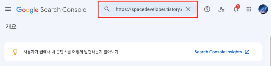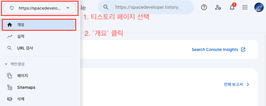 8.구글 서치 콘솔 의 좌측 상단(11시 방향) 에 햄버거 아이콘 이 보이는데, 여기서 등록한 티스토리 를 선택한 후 개요 페이지 로 이동한다.