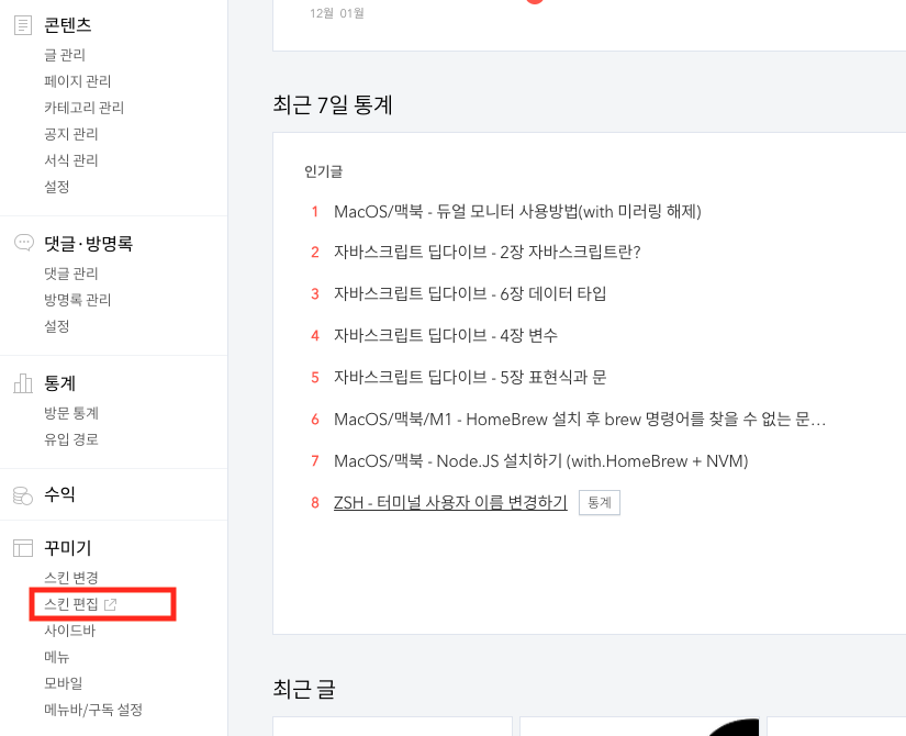 4.티스토리 관리 페이지 에서 사이드바 에 있는 스킨 편집 을 선택한 후 HTML 편집 으로 이동한다.