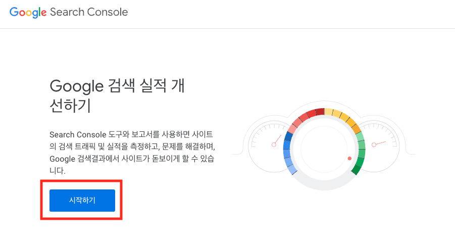 1.구글 서치 콘솔 페이지 에 접속하여, 시작하기 를 누른다.