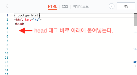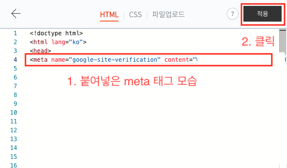 5.복사 했던 메타 태그 를 head 태그 안에 붙여넣고 적용 을 누른다.