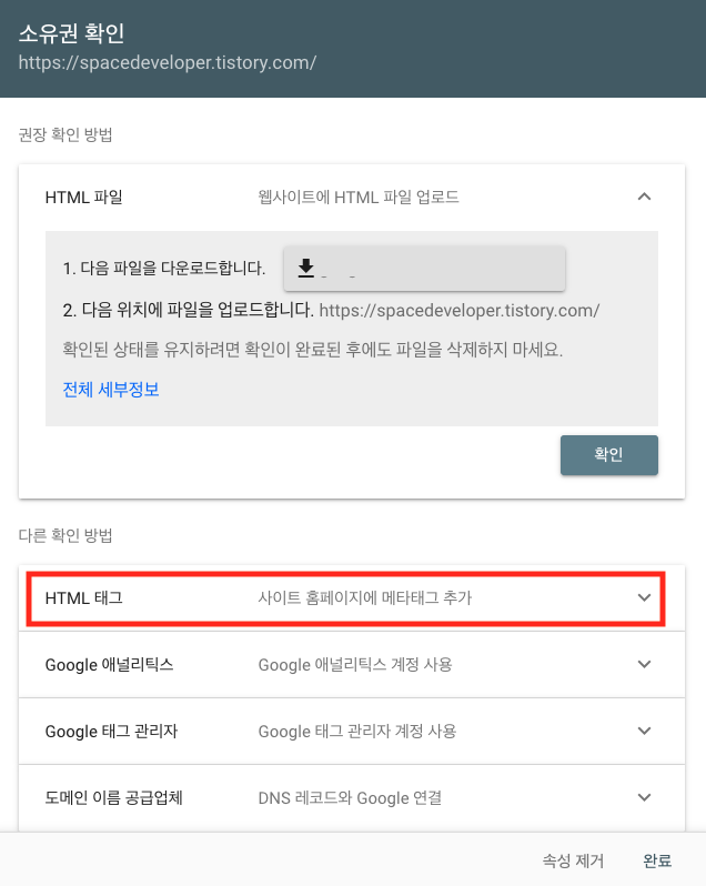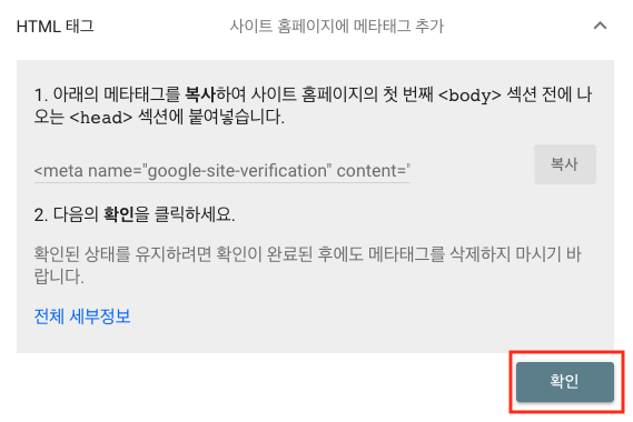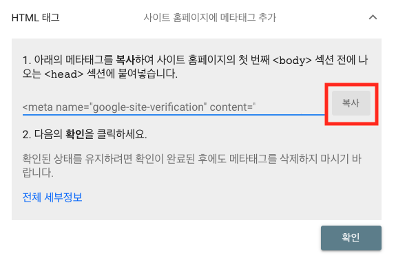3.HTML 태그 항목을 선택 하면 보여지는 메타 태그 를 복사 버튼 을 눌러 복사한다. (!중요! 확인 버튼은 누르지 않는다.)