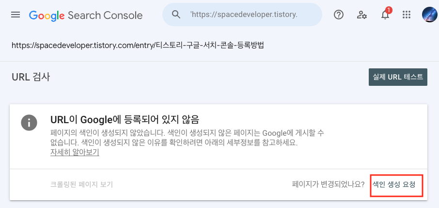 3.URL 을 검사한 후 구글 에 등록되지 않았다고 나온다. 색인 생성 요청 을 눌러주자.