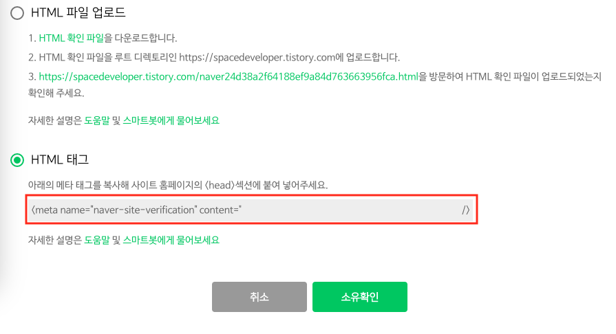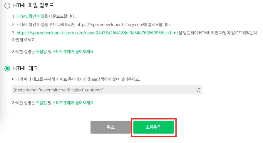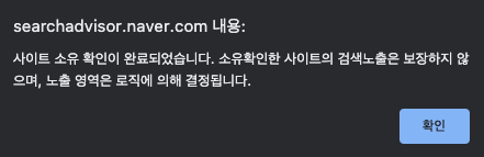 메타 태그를 발급받았던 네이버 서치 어드바이저로 다시 돌아간 후 소유 확인을 누른다.