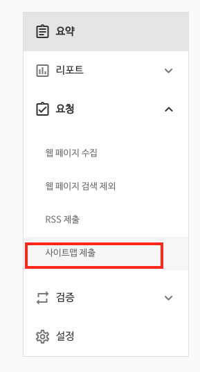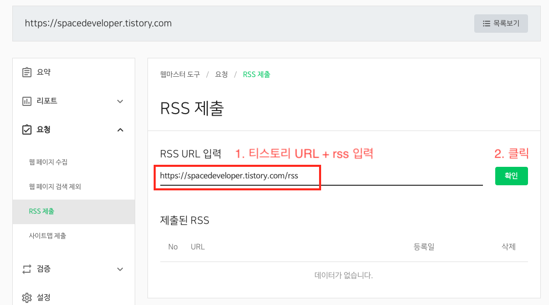 등록된 티스토리 사이트를 선택 후 사이트맵 제출 페이지로 이동해서 사이트맵 URL 을 입력한다.