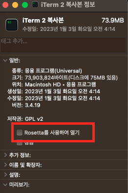 기존에 사용중이던 터미널 iterm 2 를 rosetta 2 버전으로 변경해서 사용해보자.