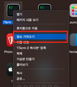 2.복제한 iterm 2 를 우클릭 해서 정보 가져오기 를 누른다.