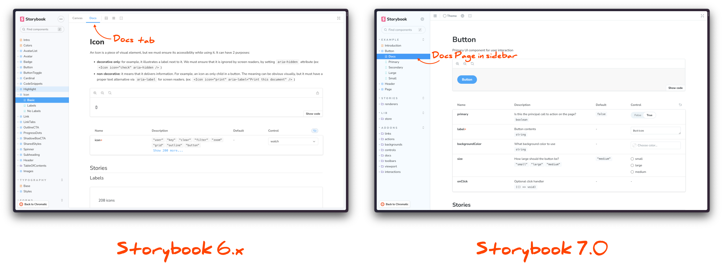 단일 컴포넌트에 대해 자동으로 설명하는 템플릿을 포함한다.기존 버전에서는 스토리마다 DOCS 탭이 존재하여 스토리를 보여줬지만, 7 버전부터는 사이드바에 별도의 Docs 문서가 존재해서 전체 스토리를 확인할 수 있다.