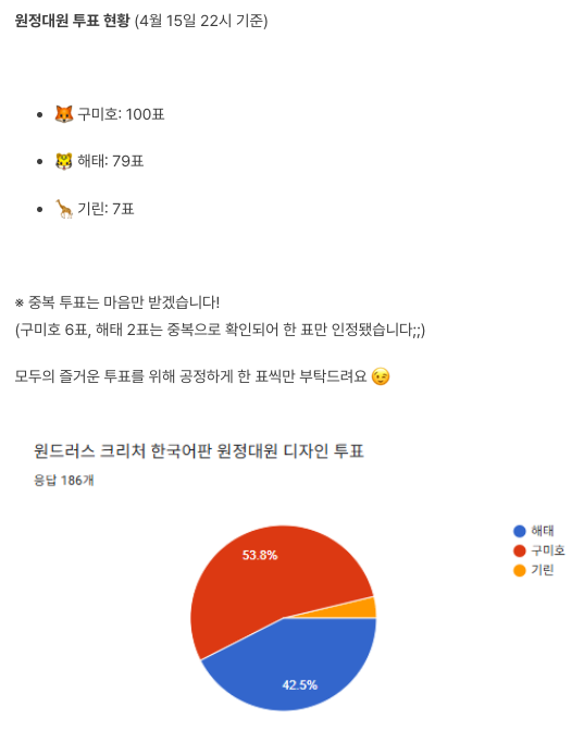 해태나 구미호 둘다 호여서 따로 투표는 안했다. 하지만 아마도 무난히 구미호가 될 것 같다.