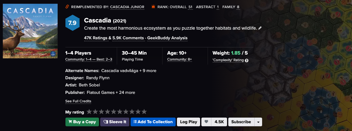 캐스캐디아 연안의 동물들이 서식할 생태계를 만들고 동물을 배치하면서 점수를 얻는 게임이다.