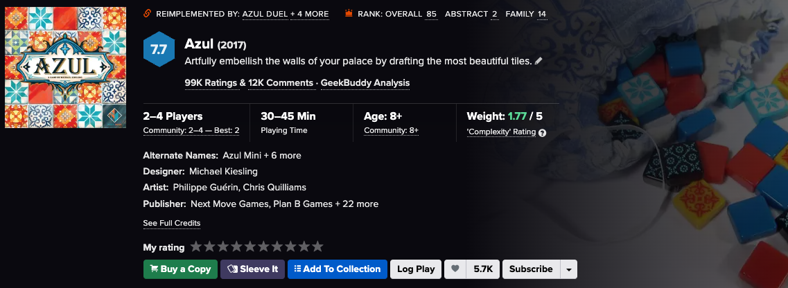 보드게임 전문 사이트에서도 굉장히 높은 점수(7.9/10.0)와 패밀리 랭킹(가족과 함께 즐길만한 게임 랭킹, 8위)을 가진 게임이다.