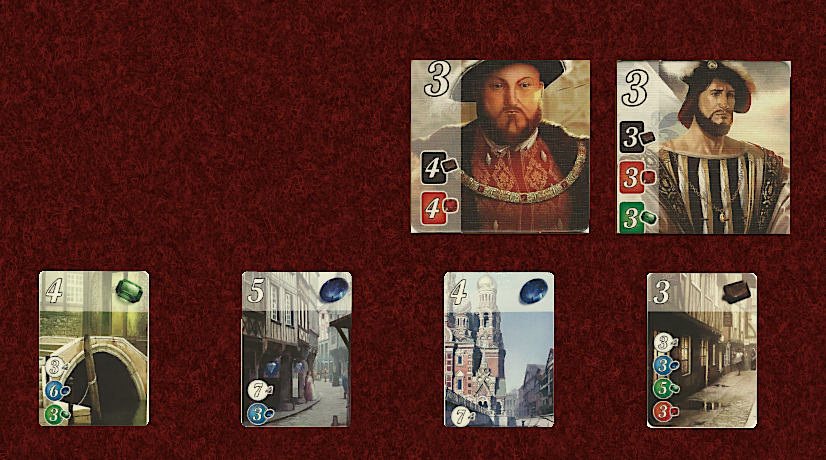 그러면 광산 개발 카드에서 두 보석을 많이 사놓으면 다른 사람보다 위의 카드를 공략하기가 더 쉬워진다.
