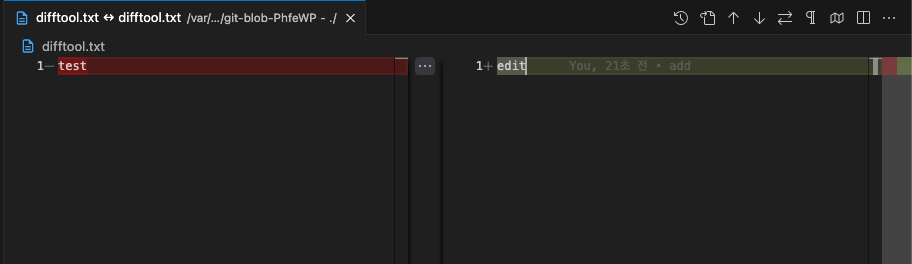 git difftool을 사용하면 VSCode 같은 GUI 툴로 훨씬 직관적으로 비교할 수 있다.