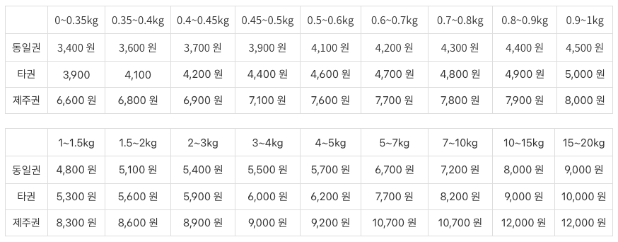 무게별로 세분화해서 가격을 책정한다. (너무 세분화되어있는데? 전체 운임료로 안알려줘서 하나하나 클릭해서 확인했다.)