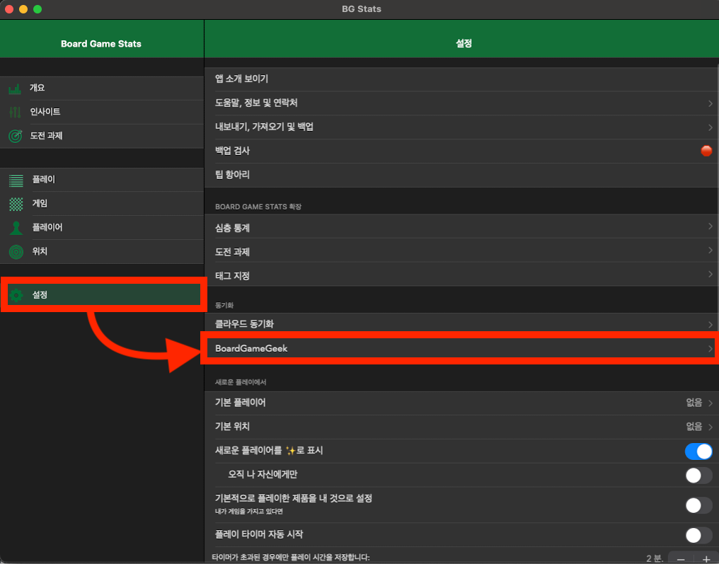 사이드바에서 "설정" 을 선택 후 "동기화" 카테고리에서 "BoardGameGeek" 을 선택한다.